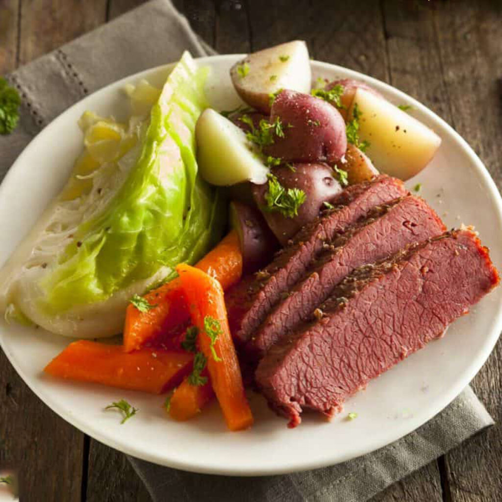 In the United States, a meal of corned beef and cabbage is closely associated with the Irish and with St. Patrick’s day in particular. I was surprised to learn that this dish was not brought over from Ireland by Irish immigrants but was developed right here.